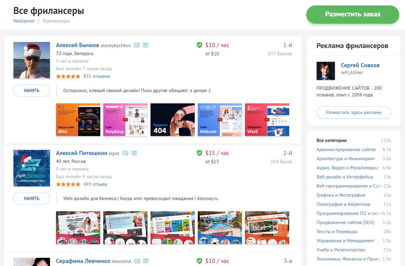 Крупнейшая биржа фриланс-услуг Weblancer осуществляет взаимодействие с профессиональными исполнителями в самых разнообразных сферах. За минимальное время Вы сможете найти исполнителя даже на самые специфические заказы. В активе биржи находятся более 100 тыс. специалистов по различным направлениям.
